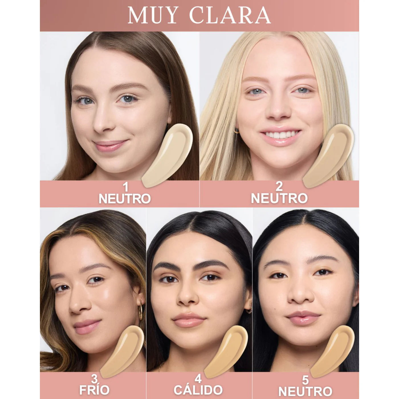 Fórmula ligera, resistente al agua y libre de aceites. Ofrece una cobertura de 24 horas con un acabado mate y uniforme. Enriquecida con niacinamida que ayuda a iluminar la piel, suavizar la textura y minimizar los poros.